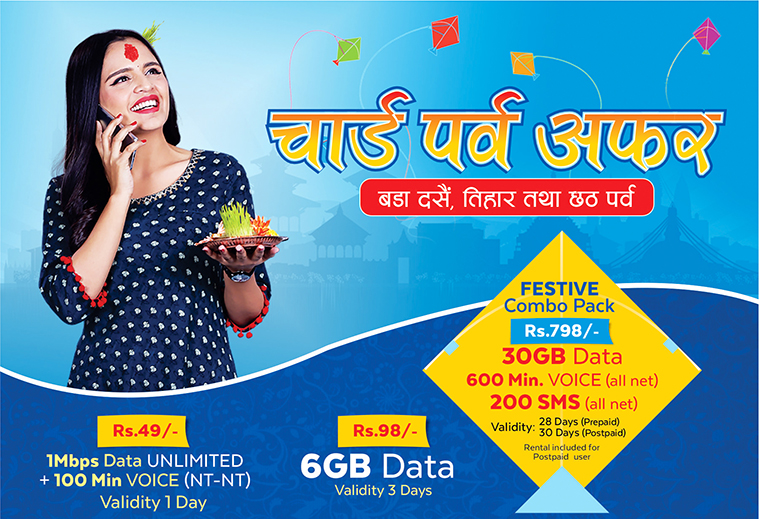 असोज २८, २०८० काठमाडौं । नेपाल टेलिकमले, दशैं अफर अन्तर्गत सहुलियत दरका डेटा र भ्वाइस प्याकसहित रिचार्ज अन बोनस उपलब्ध गराउने भएको छ । दशैंका लागि यो अफर आज असोज २८ देखि प्रारम्भ भएको छ । र आगामी कात्तिक १० गतेसम्म उपलब्ध हुनेछ । अफर अन्तर्गत रु. ४९ मा एक दिन प्रयोग गर्न सकिने १ एमबीपीएस अनलिमिटेड डेटाका साथमा नेपाल टेलिकमकै नेटवर्कमा प्रयोग गर्न सकिने १०० मिनेट भ्वाइस कल सुविधा सहितको प्याकेज उपलब्ध हुनेछ ।