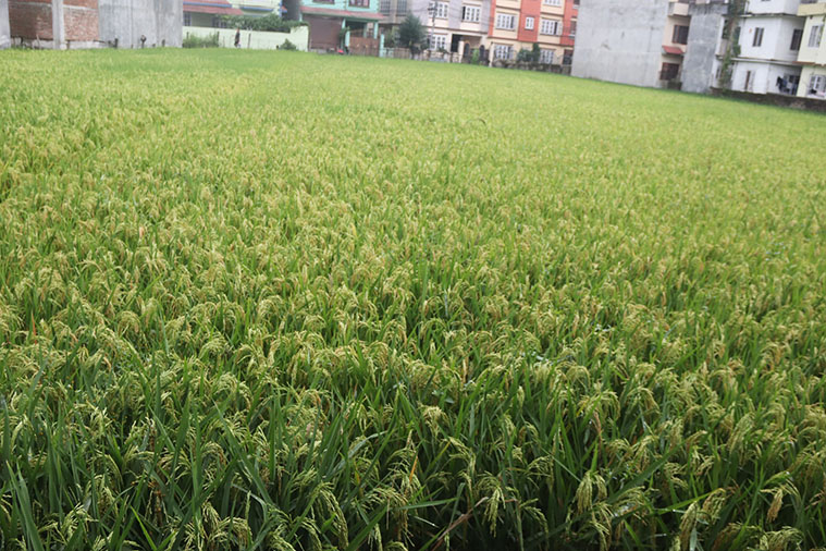काठमाडौ तारकेश्वर नगरपालिका-१० मनमैजु अवस्थित किसानले लगाएको धानको बालामा फसल लाग्दै । तस्बिर: हरिराम भेटुवाल/रासस