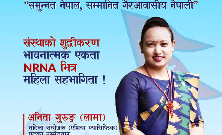 गैरआवासीय नेपाली संघ (एनआरएनए) एसिया प्यासिफिक महिला संयोजकमा अनिता गुरुङले उम्मेदवारी दिने घोषणा गरेकी छन् ।
