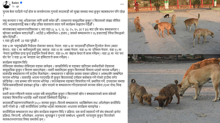 मंगलबार समाजिक सञ्जाल मार्फत काठमाडौं महानगरपालिकाको प्रमुख बालेन शाहले चुनाब बेला घरदैलो गर्दा होस वा कलसेन्टरमा गुनासो काठमाडौं को मुख्य समस्या मध्य कुकुर व्यवस्थापन पनि रहेको बताएका हुन् ।