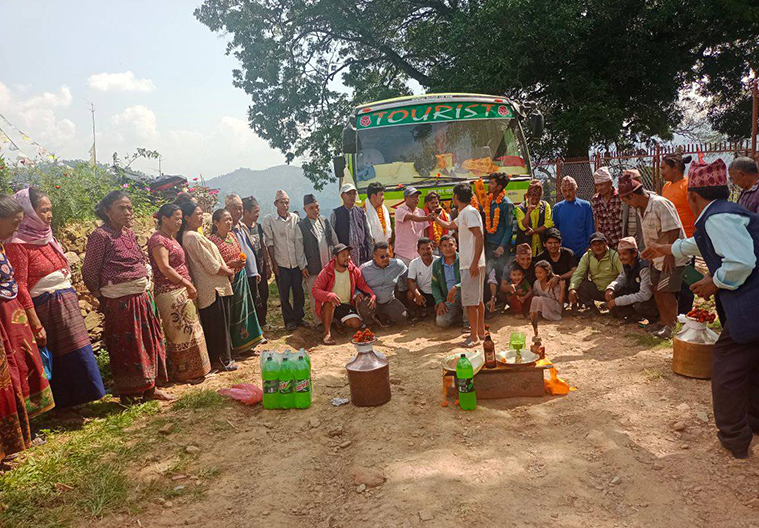 गाउँमा बस पुगेपछि स्थानीयमा खुसीयाली, पूजा गरेर स्वागत