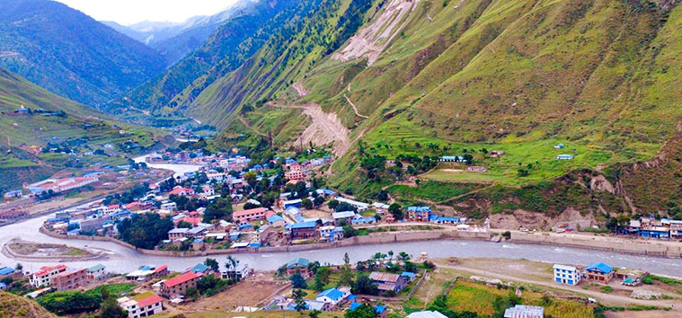 भेरी नदीको किनारमा रहेको डोल्पाको सदरमुकाम दुनै । तस्बिरः हेमन्त केसी/रासस