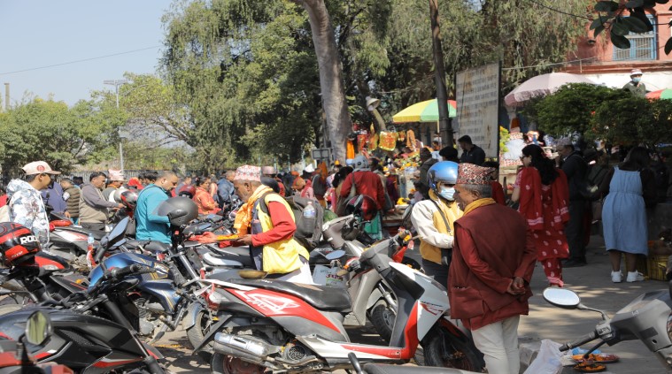 बडादसैँको आठौँ दिन आइतबार महाष्टमीको दिनमा भद्रकाली मन्दिर परिसरमा मोटरसाइकलमा पूजा गर्दैै पुरोहित । तस्बिर : किरणराज बिष्ट/रासस