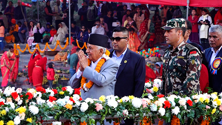 राष्ट्रपति पौडेलले गौरीघाट र कमलपोखरी पुगेर अस्ताउँदो सूर्यलाई अर्घ दिए