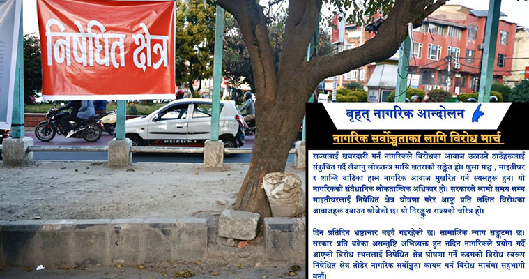 सरकारले खुलामञ्च, माइतीघर र शान्तिवाटिका लगायत नागरिकका आवाज मुखरित गर्ने ठाउँहरूमा निषेधित क्षेत्र घोषणा गरेकोमा नागरिक अगुवाहरूले त्यसको विरोध गर्दै आएका छन् । बृहत् नागरिक आन्दोलनले शुक्रबार त्यसको विरोधमा शान्तिवाटिकामा विरोध मार्च गर्न लागेको हो ।