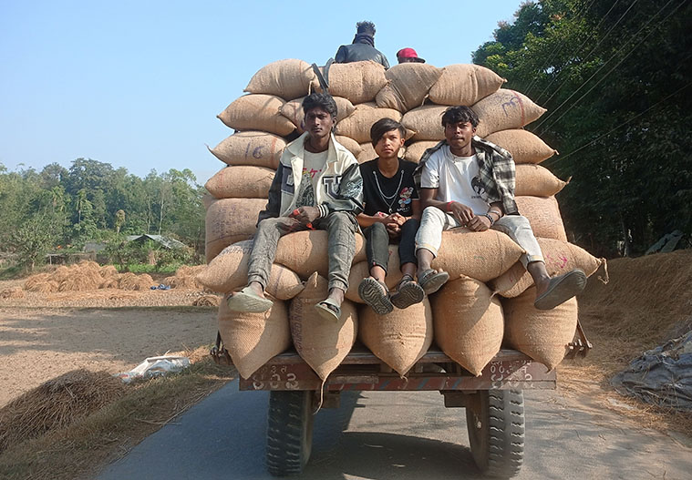 सुनसरीको इनरुवामा आइतबार ट्रयाक्टरमा राखिएको बोरामाथि बसेर जोखिमपूर्ण यात्रा गर्दै युवा । तस्बिरः नवीन गड्तौला/रासस